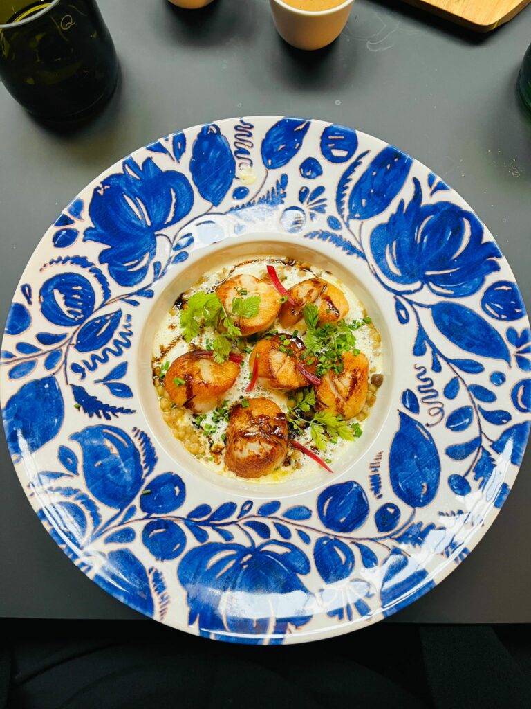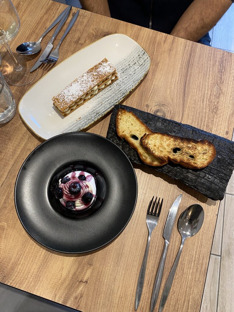 • Son assiette : un cocktail maison, une raviole et un bouillon délicat, un retour de pêche accompagné de haricots coco, et un mille-feuilles croustillant à tomber.