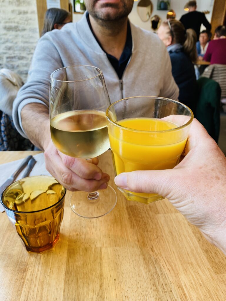 • Mon assiette : un jus d’orange, un saumon fumé maison, une pièce de bœuf fondante à souhait, et pour finir, un Mont-Nonant. Un régal !