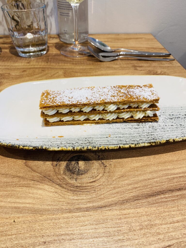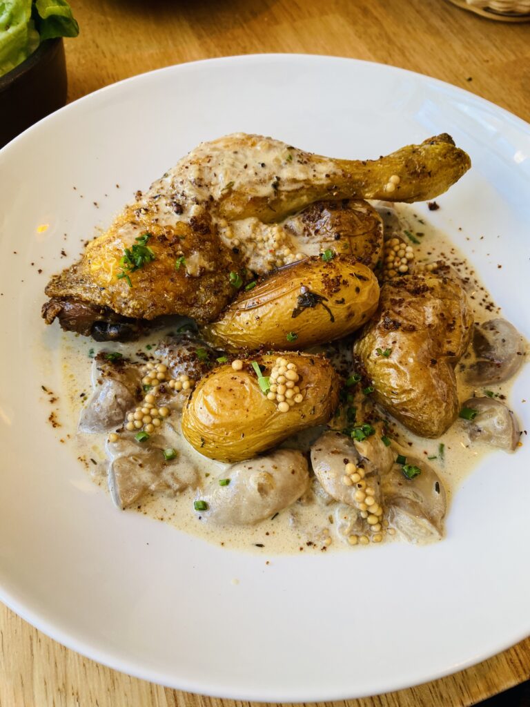 Puis, brandade de morue et tarte aux pommes pour mon mari, tandis que j’ai opté pour un poulet « Vallée d’Auge » et un chou tout chocolat, gourmand à souhait. 🍗🍎🐟