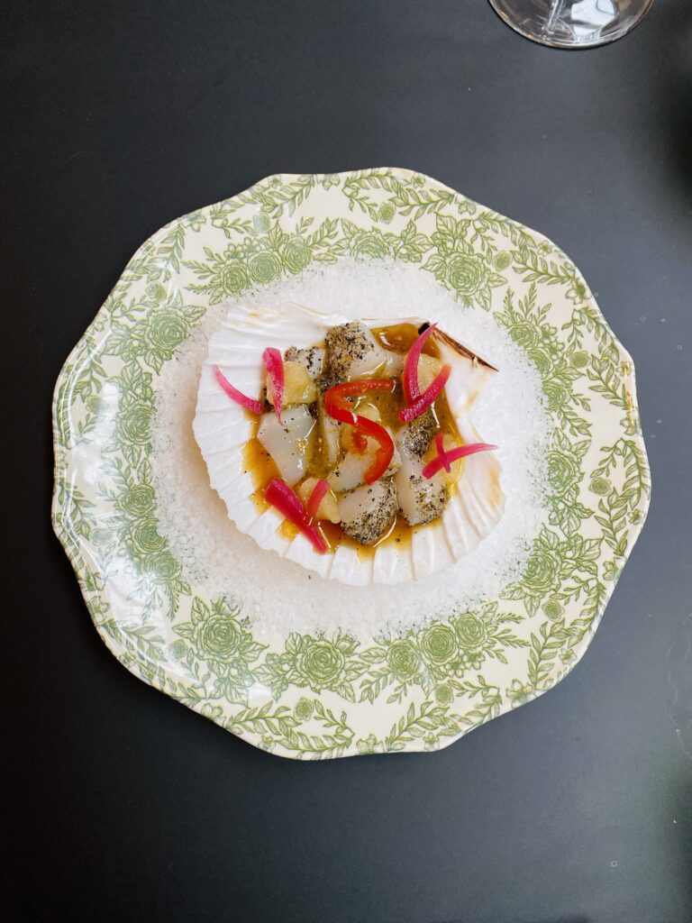 🍠Entrées : crudo de Saint‑Jacques frais et merveilleusement assaisonné / crousti fondant de patate douce