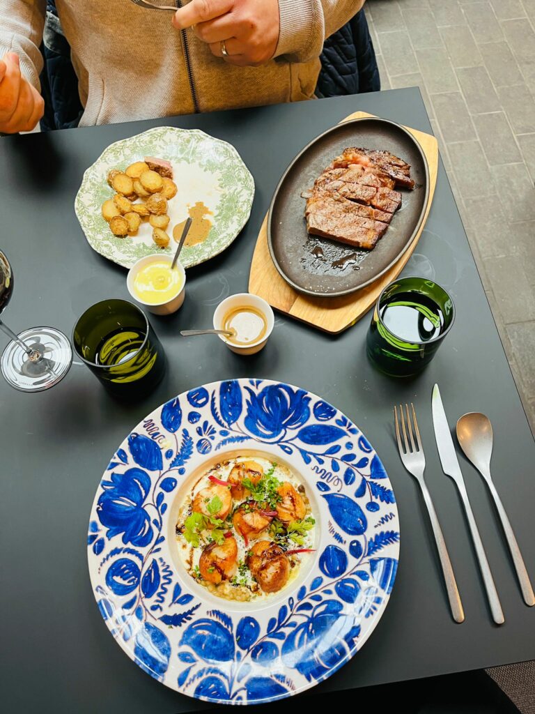 🍖Plats : Saint‑Jacques snackées pour moi / entrecôte Black Angus et pommes grenaille pour Monsieur
